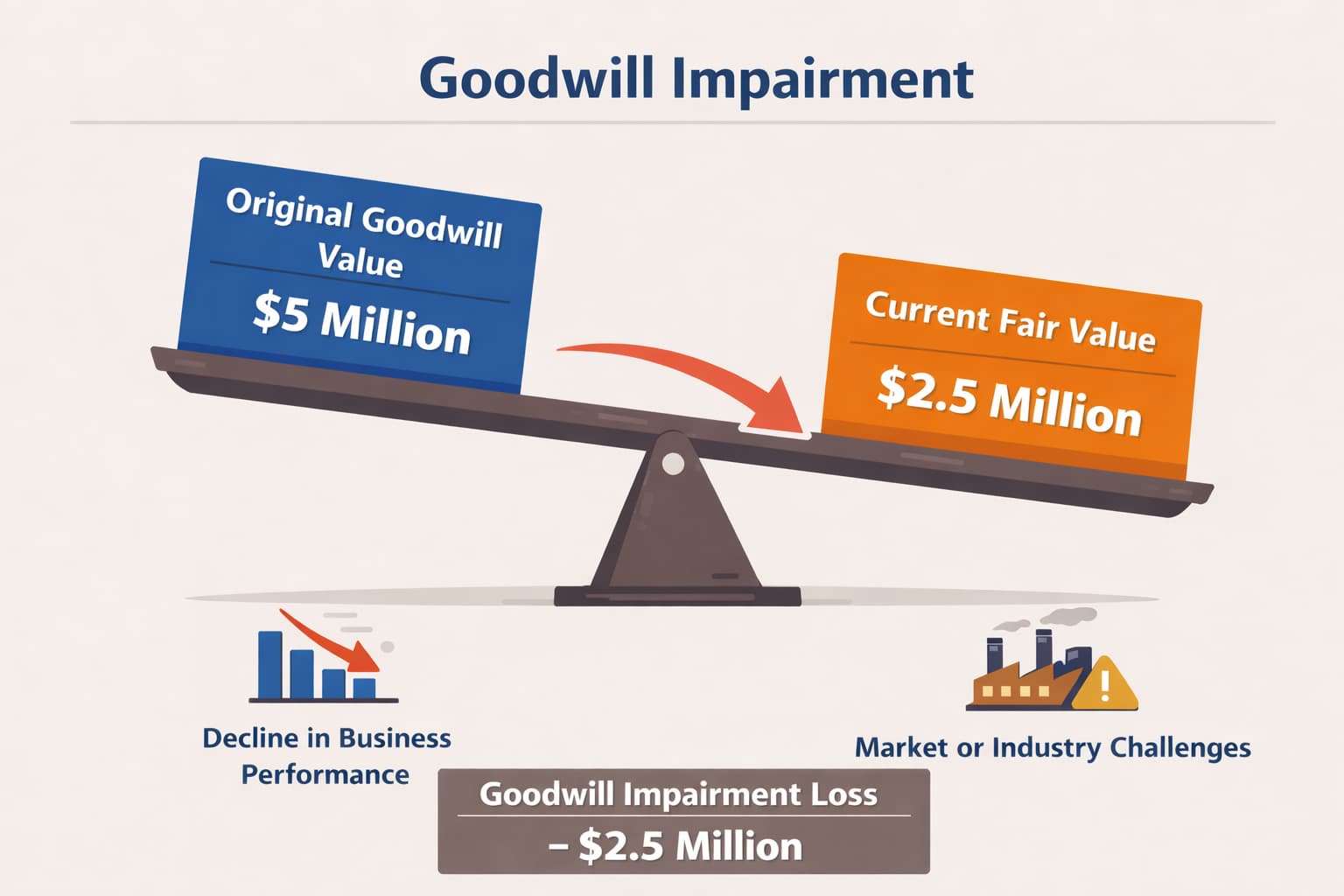 Penurunan nilai goodwill terjadi ketika nilai goodwill yang tercatat dalam laporan keuangan sudah tidak lagi mencerminkan manfaat ekonomi yang diharapkan dari suatu akuisisi. Berbeda dengan aset lain yang disusutkan secara rutin, goodwill tidak mengalami penyusutan, tetapi harus diuji secara berkala untuk memastikan nilainya masih relevan. Jika hasil pengujian menunjukkan bahwa nilai goodwill lebih tinggi dibandingkan nilai yang dapat dipulihkan, maka selisih tersebut dicatat sebagai kerugian dan akan mengurangi laba perusahaan pada periode tersebut.